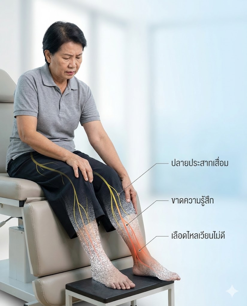 ความจริง: อาการชาที่ไม่มีความรู้สึก (Numbness) น่ากลัวกว่าอาการเจ็บครับ เพราะถ้าเราเหยียบตะปู หรือโดนน้ำร้อนลวก เราจะไม่รู้ตัวเลย ทำให้เกิดแผลเน่าเฟะโดยไม่รู้ตัว